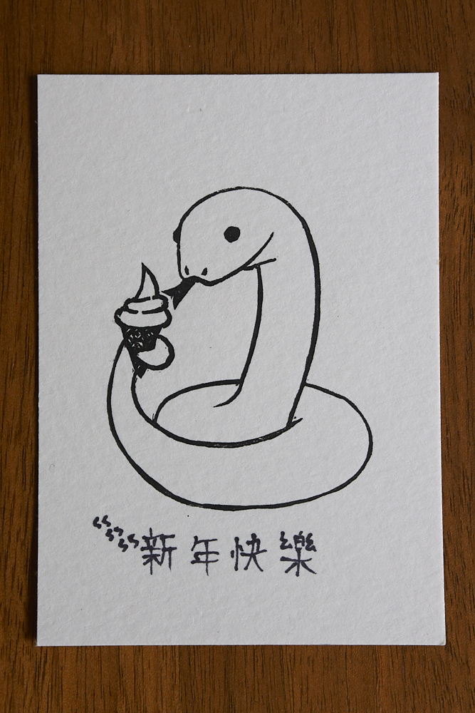 This was the first piece I worked on at a local art making gathering. I’d tried to carve the greeting of 新年快樂, but it failed pretty poorly. Hence the pretty poor hand-writing on this one. The rest were mercifully left without the greeting.