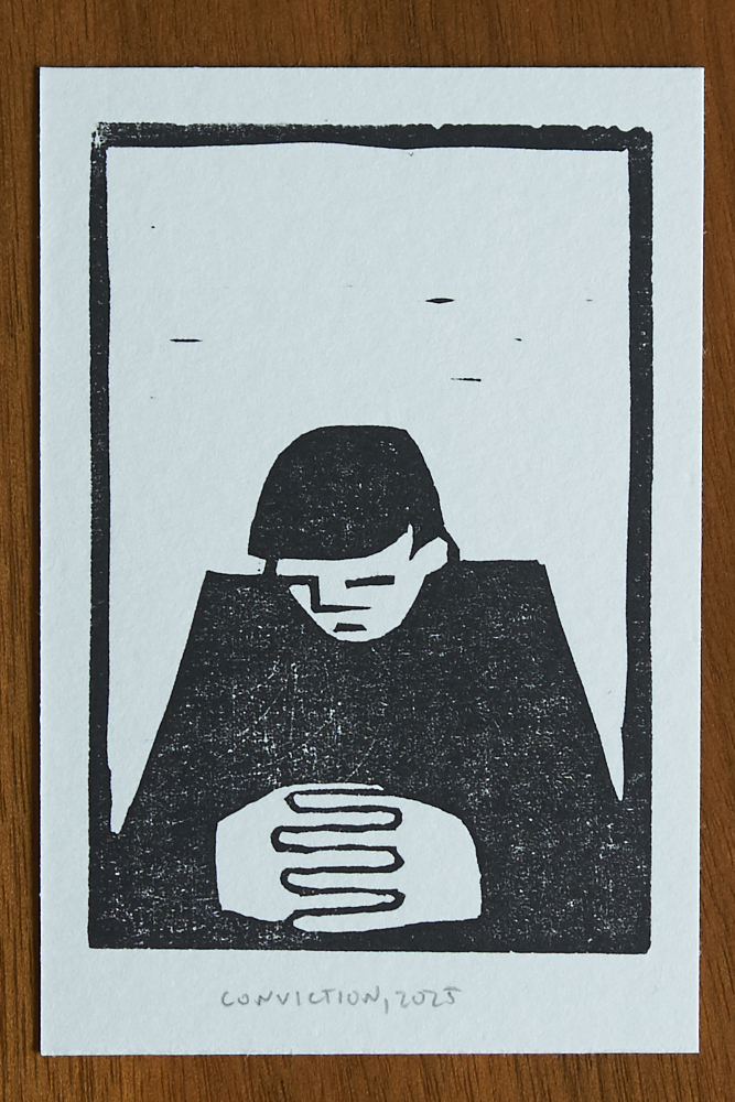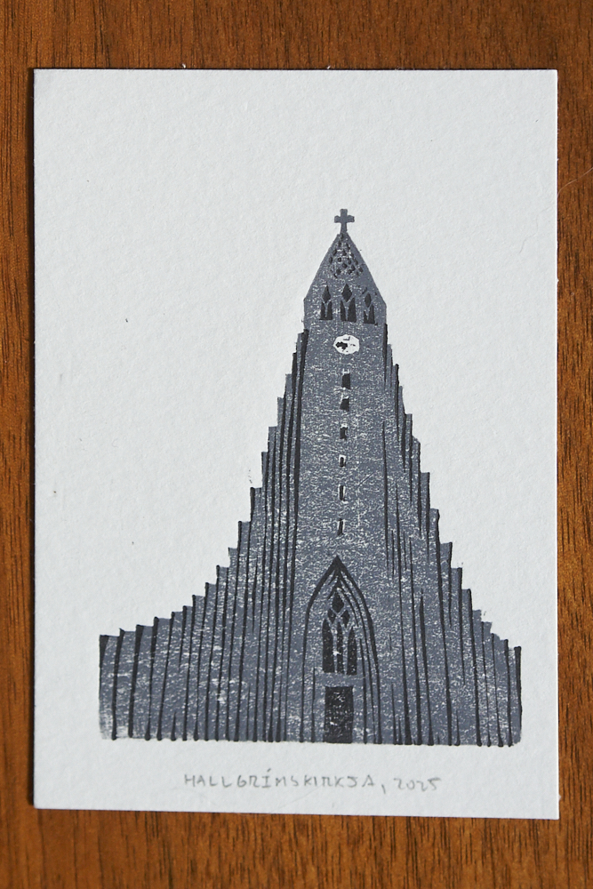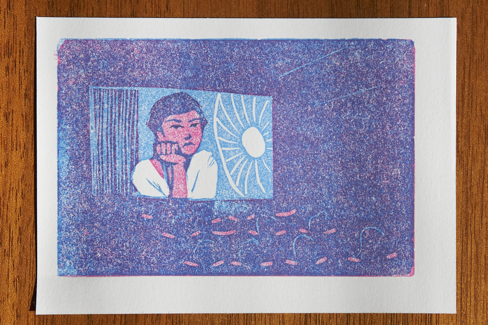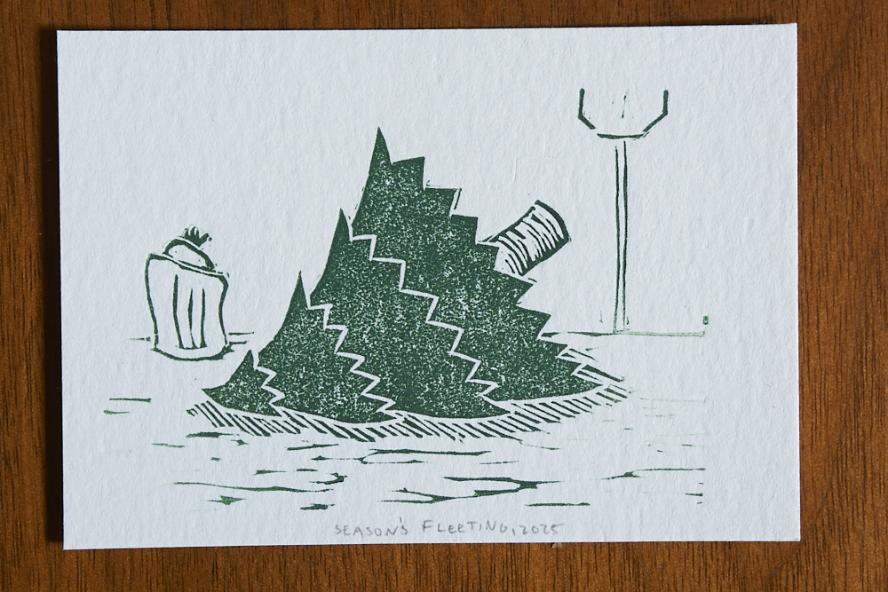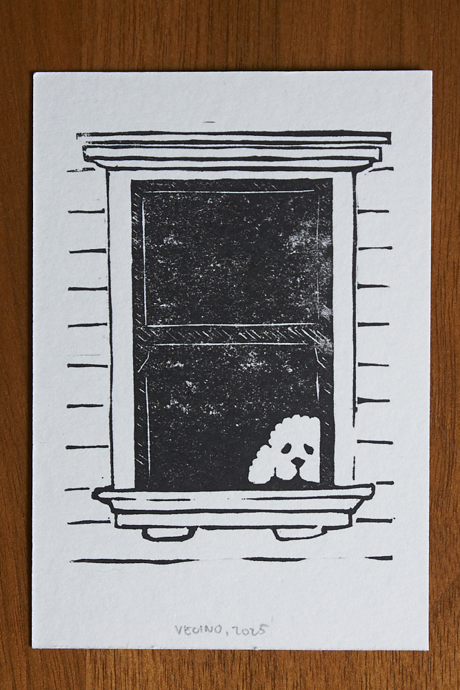 Probably my most popular print of the year. Someone I follow online used to periodically take pictures of dogs in windows that she encountered as she walked around the city, captioned simply with “vecino”. On a walk earlier in the year I encountered a neighbor dog of my own hanging out in the window, and snapped a photo, with no real plan in mind. That served as the basis for this, drawn, carved, and printed in one day.