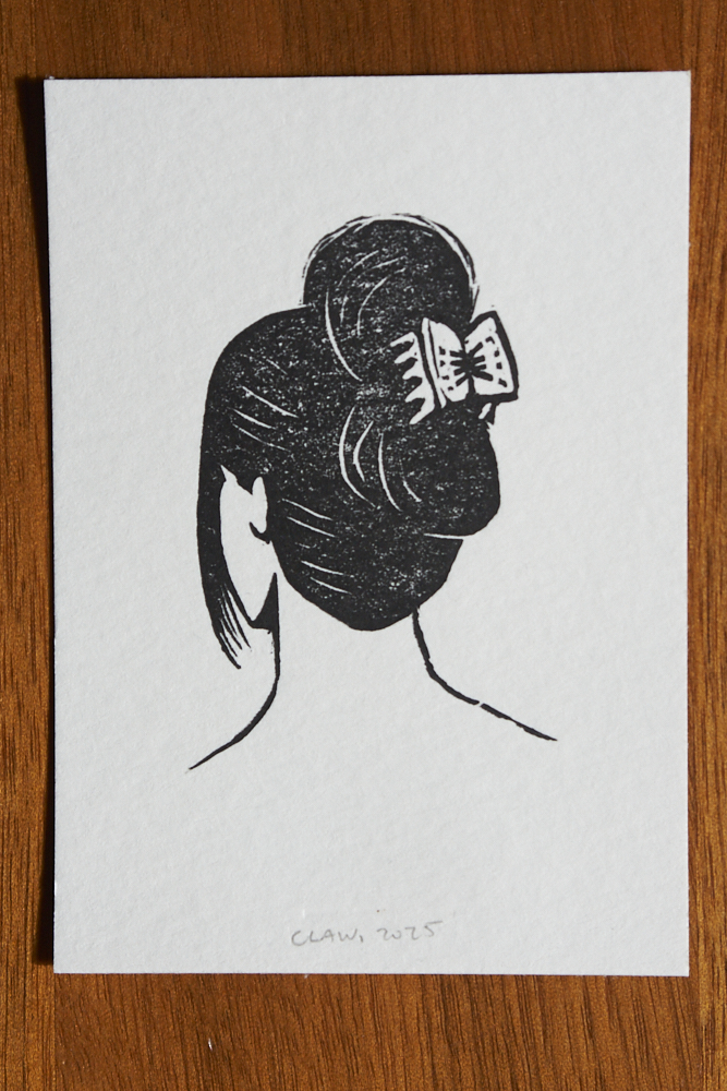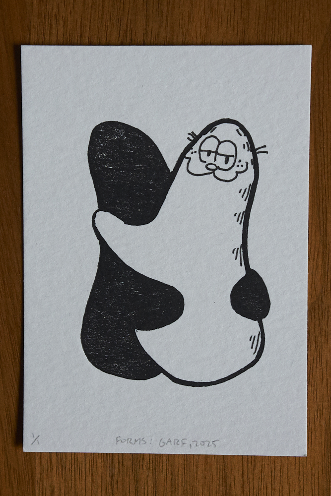 I was carved and printed in one night at Friend’s And Neighbors just to have something to work on. One of my friends who attended with me drew a Garfield face on one of the forms and created a special one-of-a-kind piece.
